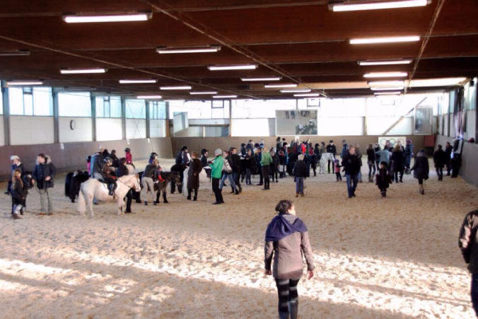 In der großen Reithalle (25 m x 55 m) mit Tribüne reiten die Privatreiter.
